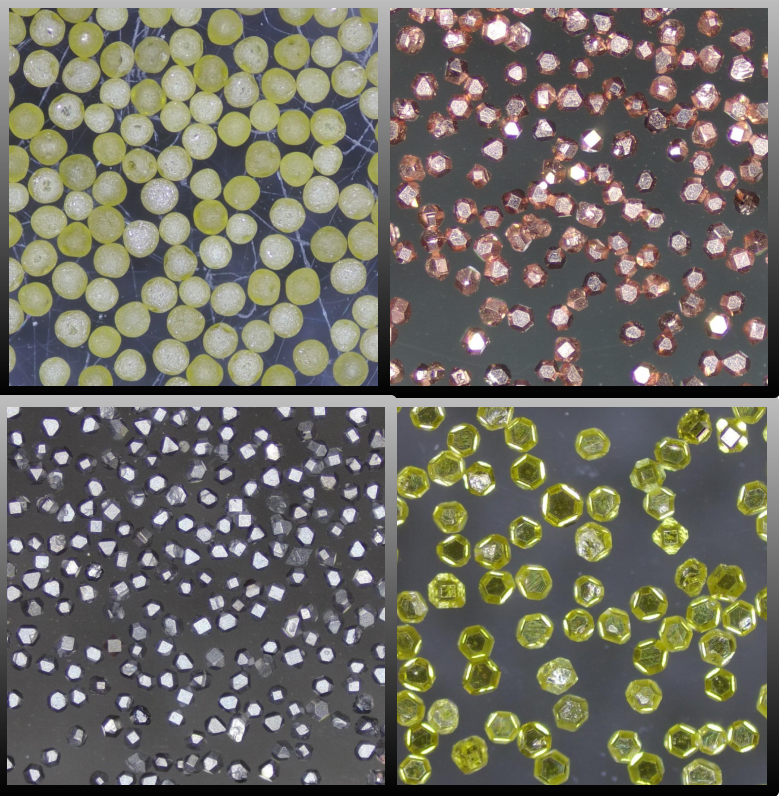 球形金刚石生产原理:将金刚石通过高压气体进行碰撞,对金刚石的棱角进行微破碎整形,不断重复以达到理想的球形度。